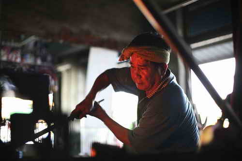 描述:郭常喜正在用人骨淬炼宝剑。走进郭常喜兴达港的刀铺,细心者会发现,熔炉下方供奉着几支人骨,终年香烟不断,他甚至还可随时搬出一整瓮人骨。