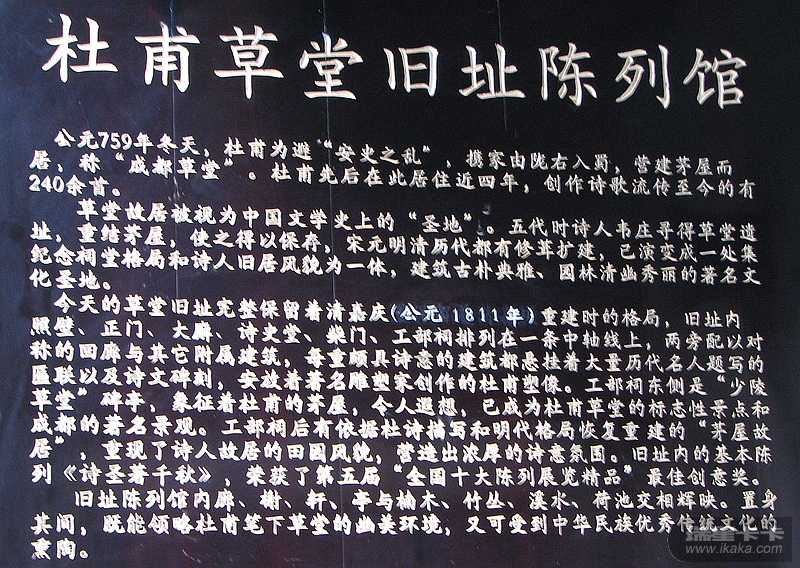 我在瑞星论坛中已有9个年头了,昔日的一些老朋友早已远去,所幸又结识了不少新朋友。为了纪念我在论坛已呆了如许春秋,最近,我专门到杜甫草堂去拍了一天(我已经好几年没到那里去了,这次去后才看到,它的规模和内容扩大了不少),整理出近80幅照片,比较全面地介绍了杜甫草堂,特别是“杜诗书法木刻廊”中,有不少过去未见过的名人书法,如郑孝胥、老舍、章炳麟、马叙伦、于右任、于立群等,这是很难得的。由于照片较多,我陆续上片吧!