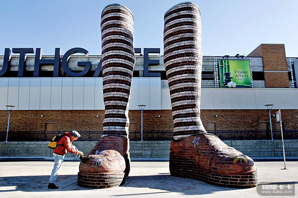 在加拿大阿尔伯塔省艾德蒙顿的一个公交车站,一名行人停下来在一只巨型脚雕塑上系鞋带.jpg