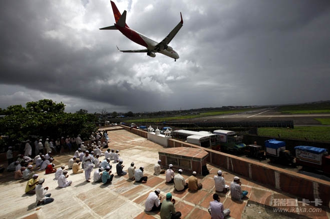 8、靠近真主:9月3日,在印度孟买,一群穆斯林信徒聚在一座清真寺的房顶上做祷告。一架飞机从他们头顶飞过,准备降落。