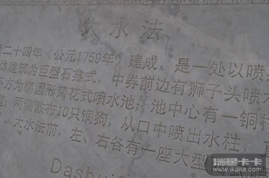 贝壳,据说散落的十二生肖兽首原来就成列在两边的。十二生肖时钟位于喷水池四周,圆明园被毁后生肖铜像全部丢失。