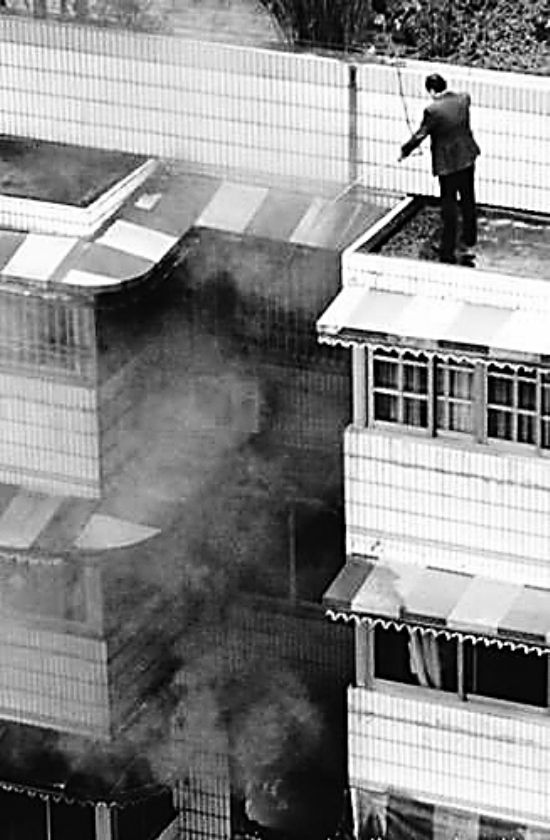 情侣纵火烧房淡定男楼顶浇水灭火(浇水哥图)
