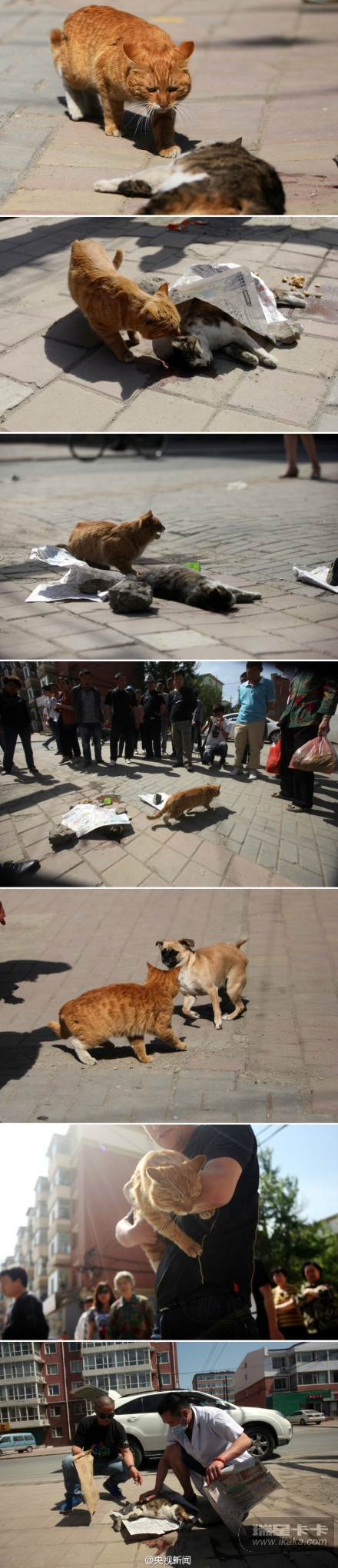 5月23日,长春市绿园区春郊路与建阳胡同交会处,一只黄花小猫守在被撞死的怀孕母猫“小花”身边长达7个小时,也不允许人们靠近“小花”。生命可贵,不要伤害它们。
