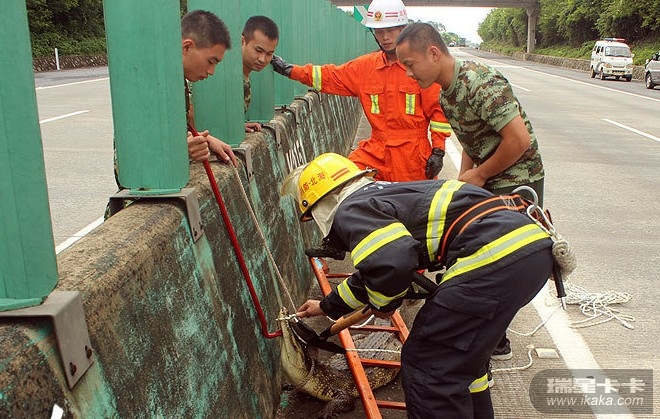在现场,一条鳄鱼趴在高速路中间的围栏下面,不时有车辆从它身边疾驰而过。消防官兵首先拿长梯子压住鳄鱼再进行抓捕,紧接着,在围栏的另一头将绳套套在了鳄鱼嘴上。大家迅速将鳄鱼的嘴巴绑住后,将它抬离了高速公路。