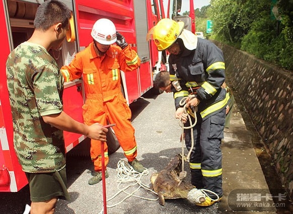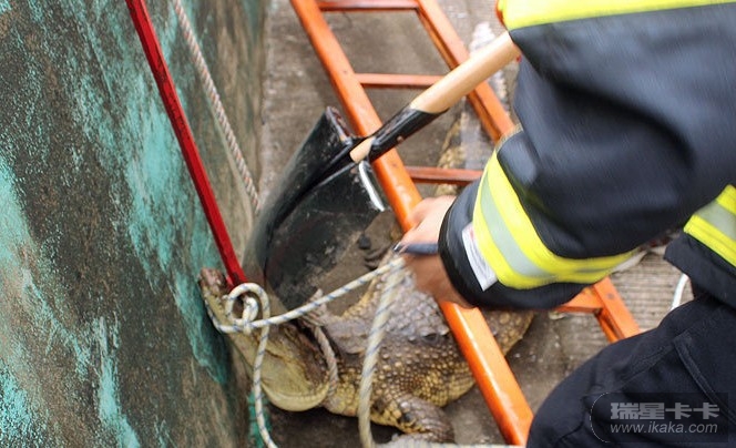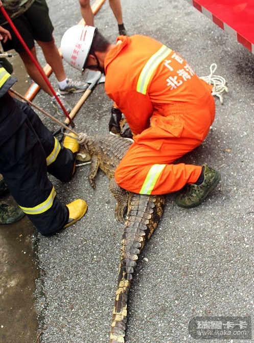 图为北海消防官兵抓捕鳄鱼现场。