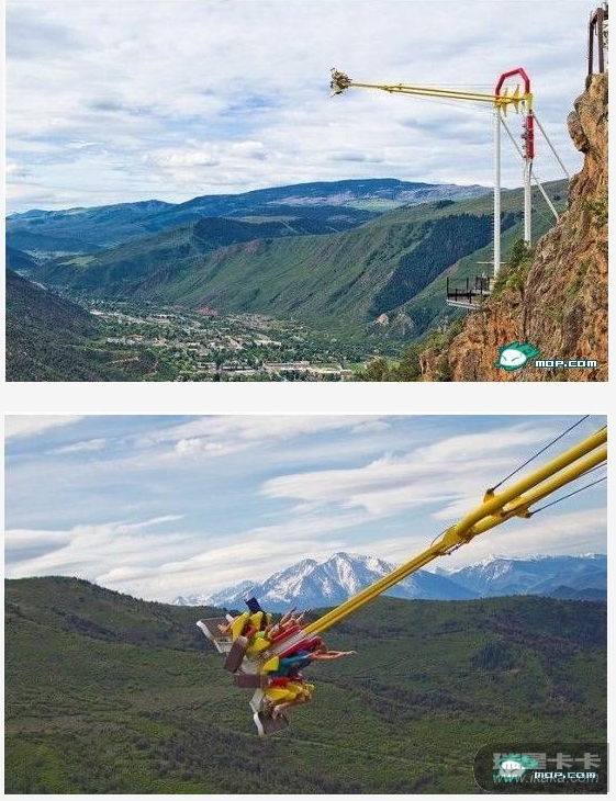在位于科罗拉多河上方1300英尺高空的大峡谷边缘,格伦伍德洞穴探险公园(GlenwoodCavernsAdventurePark)的峡谷秋千可绝不是操场上的秋千。但是如果你热爱寻求刺激,那就来试试吧!格伦伍德斯普林斯是科罗拉多的一个小镇,以各种适合家庭旅行的景点而著名。2011年,《今日美国》将它评为“美国最有趣的小镇”。但是峡谷秋千并不是大多数家长乐于让自己的孩子去玩的项目。这个“钢铁怪兽”栖息在科罗拉多河之上400米的地方,一个悬崖的一侧,能够送4个乘客以50米每小时的速度在地平线上112度角地飞起来。在最高点,寻求刺激的人们所能看见的只有仿佛无止尽的降落,令他们兴奋或害怕地尖叫。秋千的建造者,41岁的史蒂夫·贝克利也只试过一次,并从此因为害怕而再也没上去过,但是他在这次60秒的荡秋千中看到了其他人惊恐的脸,听到了他们的尖叫,因此非常高兴。最初的大峡谷秋千对贝克利来说不够极致,因为它不能送乘客到足够远的空中去,也要温和得多,所以2011年贝克利将它替换为一个更长的气动装置,有人曾经将其描述为“我坐过的最恐怖的一乘”。为了坐上这个恐怖的秋千,乘客必须先签署一份责任弃权书,低于18岁的乘客须由父母或监护人在文件上签名。为了节省时间,你可以在格伦伍德洞穴探险公园网站上下载这个文件并提前填写。据悉,最近发现了一个相似的秋千,它在厄瓜多尔,名叫“世界尽头的秋千”,但是无法判别哪个更危险些。