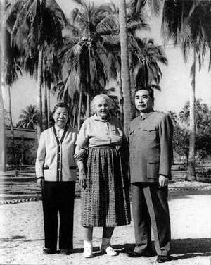 1960年2月,周恩来和邓颖超在海南岛同美国进步女作家斯特朗合影。