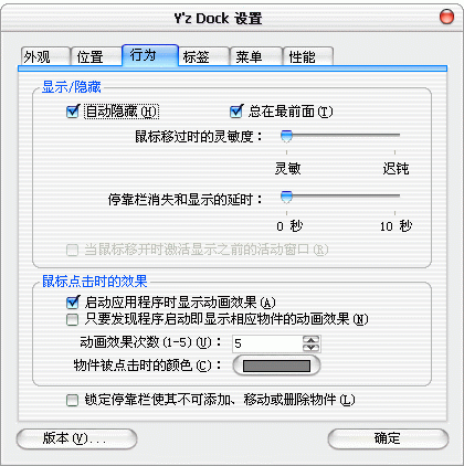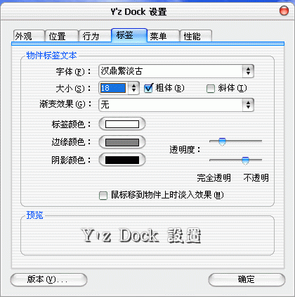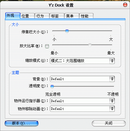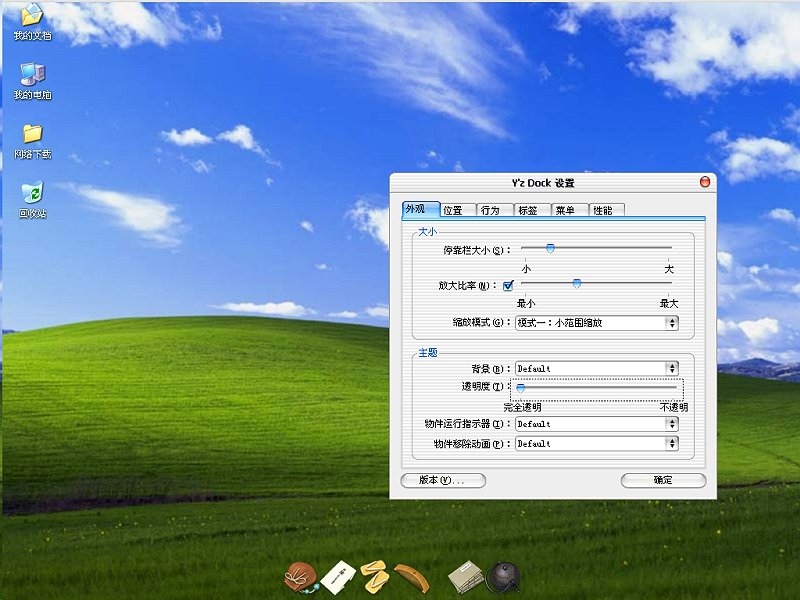把鼠标放到Y'z Dock栏中间的黑线上,点右键,选“设置”,找到一个叫做“透明度”的调节拖动条,把它拖到最左边。看!白色的背景不见了!