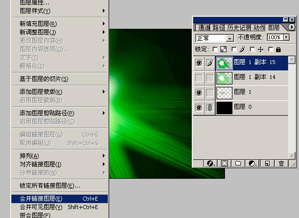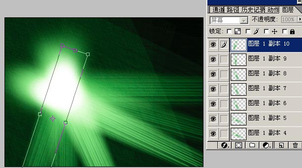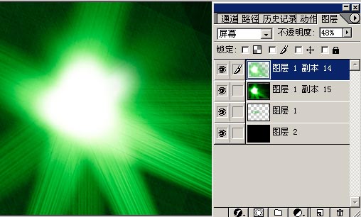 13.把第10步拼合后复制图层提到拼合到黑色背景那个层之前,混合模式为“屏幕”,透明度50%的样子。