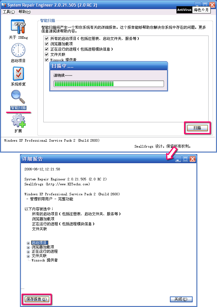 扫描完成后出现“详细报告”对话框,显示了扫描结果报告内容,点击“保存报告”可以保存扫描报告为LOG文件,默认文件名SREngLOG.LOG。