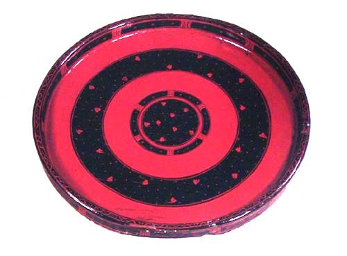 彩绘鸟云纹大圆盘 (口径32.5,高3.5cm) 木胎,旋制。器形较大,圆形,直口,浅盘,平底,盘外与内底正中及其中部髹二道黑漆,并在黑漆地上用红、灰黑无光漆彩绘花纹:内底中心与第三圈以红漆绘鸟云纹、圆卷纹和灰黑元光漆绘卷云纹,第二圈为变形鸟头纹,口沿内外用红、褐漆绘鸟头纹、卷云纹等纹样,口沿上绘波折纹、点纹。