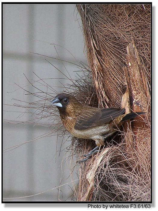 文鸟那张拍摄距离不远,大概也就两米吧.它在撕棕榈树的纤维,可能是要筑巢.这鸟不怎么怕人:)