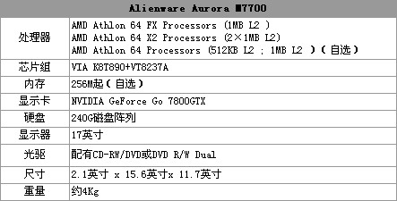 Aurora M7700采用了17英寸高亮宽屏LCD显示屏幕,内置目前Nvidia中最高端的GeForce Go7800 GTX显卡,绝对可以满足游戏发烧友对高性能显卡的最求。M7700采用了AMD 64位处理器,而这也是Alienware在其移动装置上首次应用了AMD Athlon处理器,同时也是其首款AMD Athlon 64双核心处理器笔记本。另外,M7700的硬盘容量更达到了240GB(2x120GB),支持RAID 0和RAID 1模式,而结合2G的内存的话绝对可以让它可以轻松驾驭市面上任何一款游戏,是游戏笔记本中的顶级之作。加上Alienware产品的外型十分的酷,对于爱酷的潮流一族最适合不过。不过这款游戏笔记本也是价格不菲,在美国的标价差不多要3000美元,更可惜的是Alienware还没有登录中国市场,真是有钱都买不到。