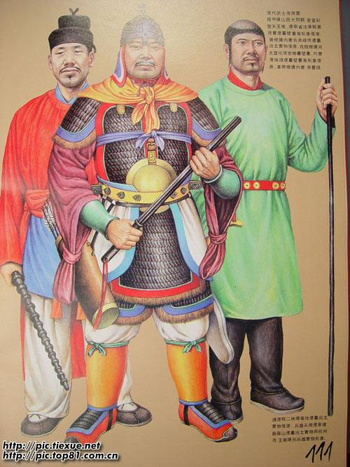 19.清代一般的盔帽,无论是用铁或用皮革制品,都在表面髹漆。盔帽前后左右各有一梁,额前正中突出一块遮眉,其上有舞擎及覆碗,碗上有形似酒盅的盔盘,盔盘中间竖有一根插缨枪、雕翎或獭尾用的铁或铜管。后垂石青等色的丝绸护领,护颈及护耳,上绣有纹样,并缀以铜或铁泡钉。铠甲分甲衣和围裳。甲衣肩上装有护肩,护肩下有护腋;另在胸前和背后个佩一块金属的护心镜,镜下前襟的接缝处另佩一块梯形护腹,名叫“前挡”。腰间左侧佩“左挡”,右侧不佩挡,留作佩弓箭囊等用。围裳分为左、右两幅,穿时用带系于腰间。在两幅围裳之间正中处,覆有质料相同的虎头蔽膝。本图为清代戴盔帽、穿铠甲武士复原图。
