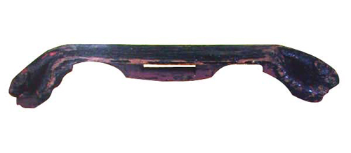 彩绘双虎头形盾 (长56,宽10.5,高9.3cm) 木胎,雕制。扁长形,正面微呈弧形。两端各雕一虎头,虎口咬住一横木,两前爪亦抓此横木。背面正中部有一把手。通体髹黑漆,虎腹与把手上再髹红漆,虎前爪、额和颈部用红漆绘花纹。