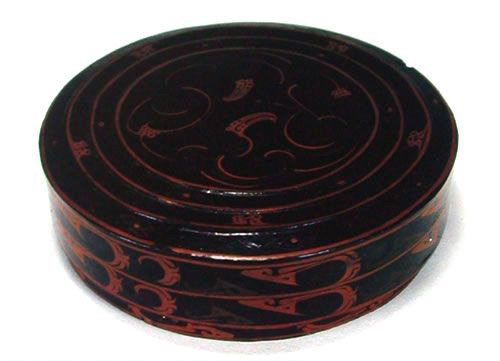 彩绘鸟云纹双层圆奁 (上层口径21.6,下层口径20.9,通高7.9cm) 盖、底为厚木胎,斫制;盖沿与器壁为薄木胎,卷制。双层圆奁由盖、器身套合而成。直口,直壁,平底,盖顶隆起。器内髹红漆,器外髹黑漆,盖面用红、褐漆和金色彩绘鸟云纹、变形鸟头纹等优美纹样,盖沿与上层器外壁绘鸟云纹,下层器外壁绘菱形纹。出土时,奁里放铜镜、玉壁、木梳各1件,木篦3件,木刮刀2件。