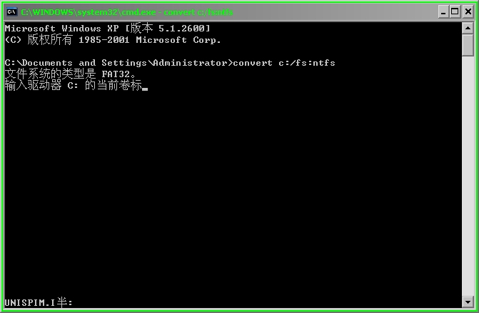 2. 打开窗口以后,在光标的提示符下输入“covert c:/FS:NTFS”,然后回车。注意在“covert”的后面有一个空格。