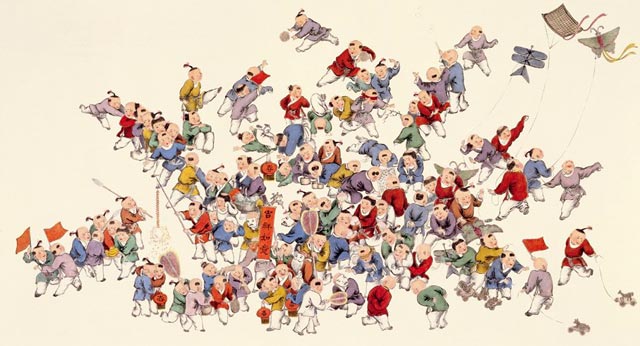 画着众多小孩,祈求多子多孙的画。杨绯桢《六宫戏婴图》诗:“百子图开翠屏底,戏弄碰扭未生齿。”宋代辛弃疾《稼轩词·鹧鸪天·祝良显家牡丹一本百朵》:“恰如翠幙高堂上,来看红衫百子图。”