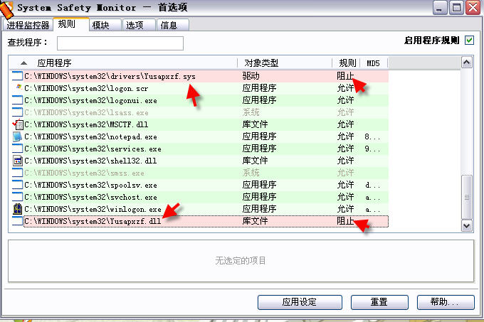 2/安装SSM 2.0.0.559。启动所有模块监控,并在应用程序规则中添加两条规则,分别阻止这个Rootkit的.dll和.sys加载(见附图)。最后,将SSM设置为启动加载。