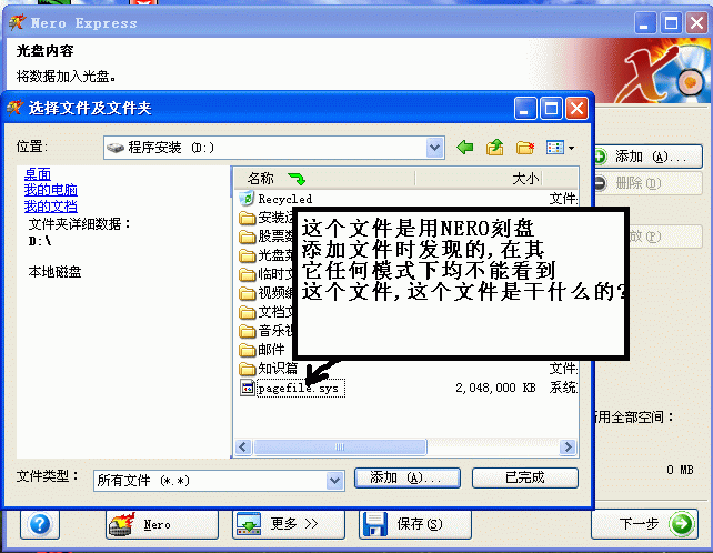 在用NERO刻盘添加文件时,在D盘上发现一个文件.这个文件只有在NERO添加文件时才能看到,而在系统显示的任何模式下都不能看到这个文件,奇怪的是在D盘搜索这个文件也搜索不到!!请教高手这是一个什么文件?如下图: