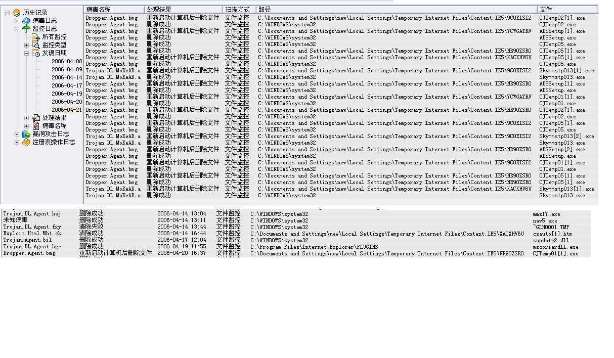 从4月14日开始中毒以来,这些病毒随着每次删除——机子重起——打开网页,又重新出现在我的电脑上。病毒资料在下面的图片里。
