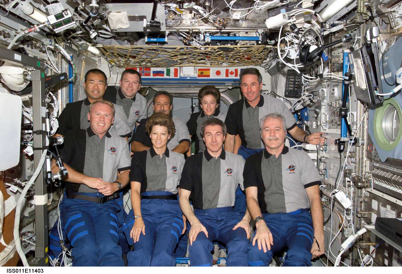2005年8月2日,第11考察组与发现号宇航员在国际空间站宿命号太空舱一起合影,共9人。