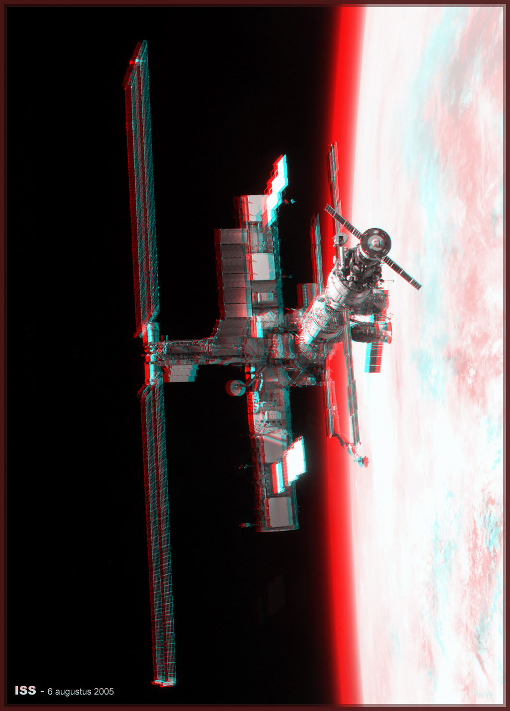 这是国际空间站的3D立体照片,请用红蓝眼镜观看,会给你一个意外惊喜。若没有这种眼镜,可用红蓝玻璃纸自制,红的左边,蓝的右边。