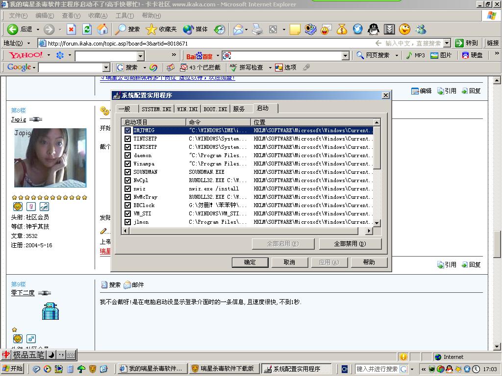 谢谢各位,看样我的计算机是中毒了,我刚刚在网上在线用金山毒霸杀了24个病毒后,瑞星现在使用正常,但在每次开机前还是会出现一条不知明的信息,而且一闪而过,我根本看不到是什么信息,好像是提示启动程序某个地方出错(是我自己猜的,其实我是不懂英文的).各位谁能帮我解决一下呀!谢谢你们了!