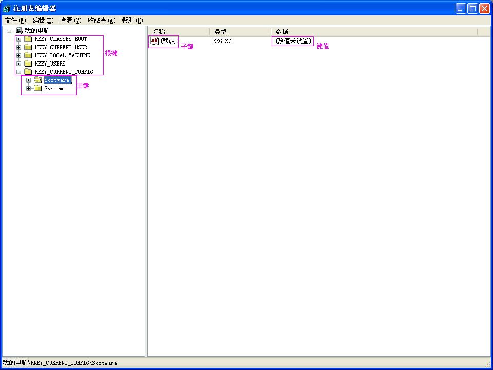 子键:子键位于主键下,又可以嵌套于其他子键中。在注册表的六大根键中,有若干的子键,而每个子键中又可以嵌套成千上万的子键。