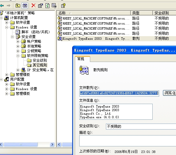 问题初现:因为受限用户下不能安装程序,我就通过管理员身份安装了金山打字通2003,完成后双击桌面上的打字通图标,不能运行,并且出现下图所示的对话框。重装几次都未能解决[把该用户设为管理员时即可操作,改回来后,故障重现];再就是优化大师,金山快译等注册过软件,都成了未注册的;在切换用户时一闪而过再无反应,按windows会徽+L进入锁定状态,只有注销进行切换。