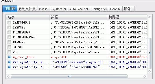 所有的启动项目(包括注册表、启动文件夹、服务等)
