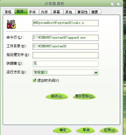 是开始菜单里的快捷方式,不知道什么时候把计算器的的文件给改了,开始菜单里它的图标变成一窗口的样子,就是应用程序的图标,不是它原来的图标,然后找到一个相似文件,偶也没看就点"确定"了(就算看了也不知道是不是计算器的文件,偶对系统文件不了解),结果就变成指向MS-DOS的了