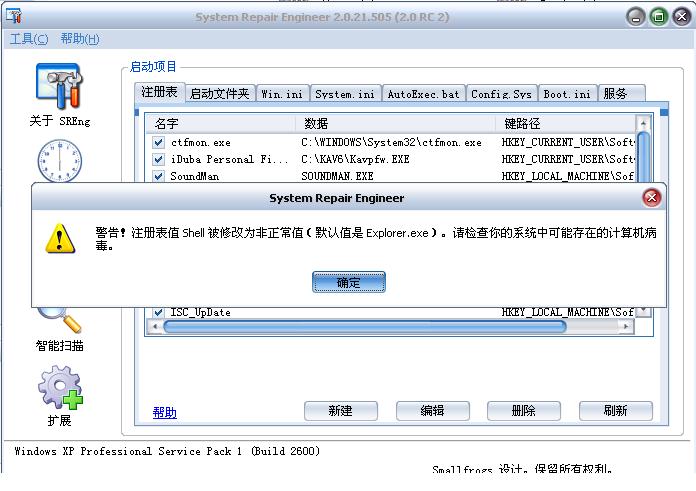 打开SREng2提示说Shell被修改为非正常值,说有病毒,可是偶不知道怎么把这个个弄回来,而且我也不知道到底那里有病毒~~~55555555~~~~~