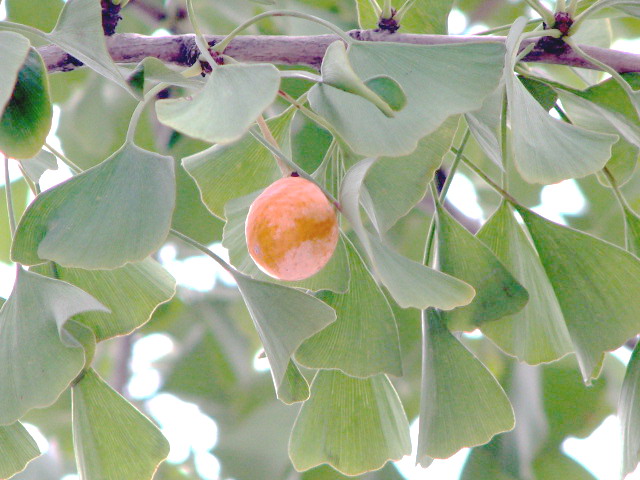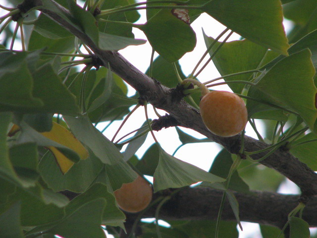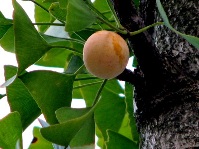 放午学时,无意间看到银杏舒朗的枝叶间露出星星点点的黄,起初以为是黄叶,继而一想,不对呀,初秋的银杏那来的黄叶呢?于是特地站到树下多长了两眼——那哪里是黄叶啊,分明是一粒粒圆润微黄的成熟杏果呀!