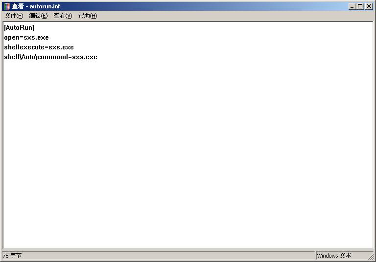 用winrar打开后只有autorun.inf文件,内容如下图,注册表中所说路径下没有任何东西,删除autorun.inf后仍然没有解决问题