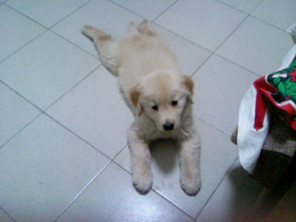 第一天回家留念,一点儿不认生,围着墙角转了不下10圈后,尿了。