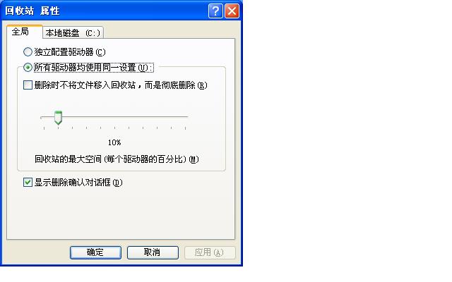 ADL 先生说的方法我试过了,不是不行,不过我的回收站属性里只有全局和C盘,没有其他的D/E/F盘.