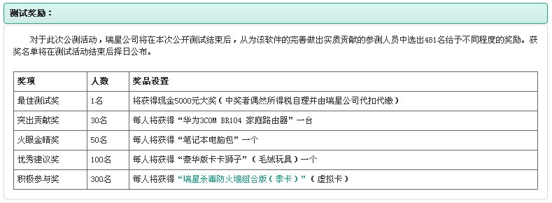 众所周知,瑞星2007早已经开始进行公测,为了吸引社会中的高手们参与到瑞星的测试中,以便做出更好的产品,瑞星将公测版公布于众,并对测试突出者进行奖励,可是奖励也有点太少了吧,这么大的一个公司,就出这么一点钱,能吸引到高水平的测试人员吗?别说别人都在乎钱,这是应该花的,以后产品做好了,不早就大把大把挣回来了吗?