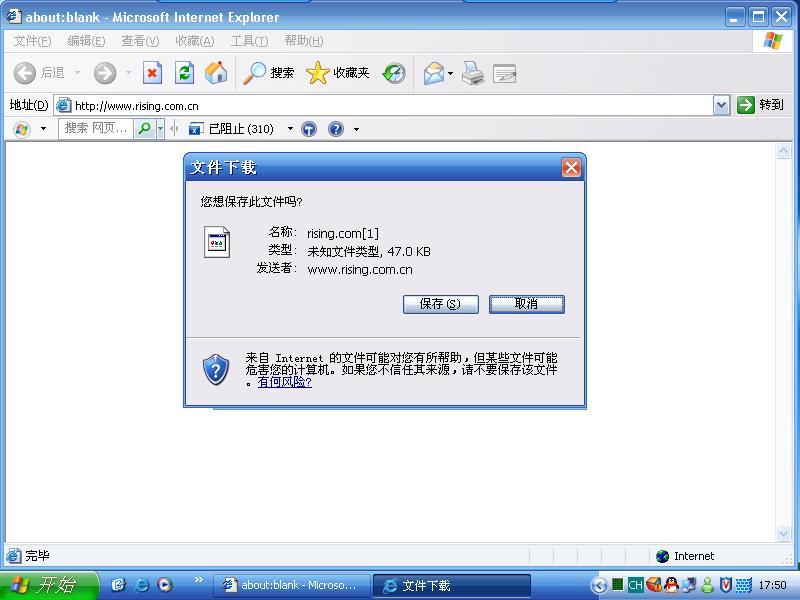 打开瑞星网页会弹出个下载对话筐,不知道是不是我用了遨游,GreenBrowser等浏览器的原因,有时打开瑞星主页的时候就不是直接打开主页,而是弹出一个对话筐,但是只要清除IE临时文件夹就可以打开,如果不清除IE临时文件夹那么用IE也是不能打开瑞星网页