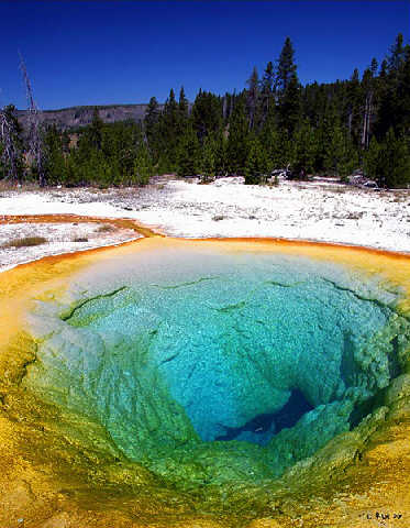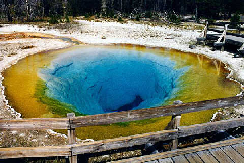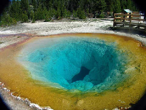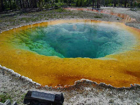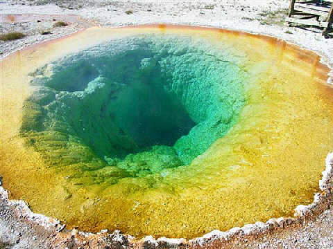 美国著名的黄石公园有数以千计的温泉,这些温泉碧波荡漾,水雾缭绕;上百个间歇泉喷射着沸腾的水柱。而在这些温泉中最漂亮的要数Morning Glory Pool温泉。Morning Glory Pool属于热泉,它的温度通常比间歇泉低得多,所以其中可以繁衍出丰富的藻类。Morning Glory Pool温泉最大的特点是:它们的颜色随着水温的变化而不同。水温在85℃时,泉内藻类为白色;82℃时为肉红色;74℃时浅黄色;68℃时为黄绿色。