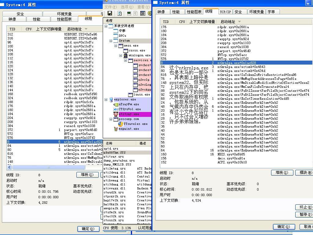 随机文件名的驱动只存在与系统核心内存中,没有启动项,驱动的名称在注册表里也找不到,相关的EXE文件也无法找到路径,似乎也是内存中的幽灵,平时若无其事,只要联网就凶相毕露,杀毒软件根本就是无奈的摆设,冰刃之类在我这菜虫手中也是杀不了耗子的钝刀,AUTORUNS\SREngPS也看不出任何异常。请看我的贴图,如何才能把这种木马拖出系统,请高人指点。[好像是飘雪木马的变种]