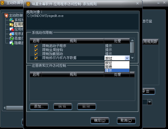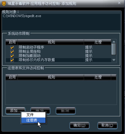 1.打开杀毒软件/防御设置/应用程序访问控制,选择添加,通过添加,把C:\WINDOWS\regedit.exe这个程序,添加到规则里。如图: