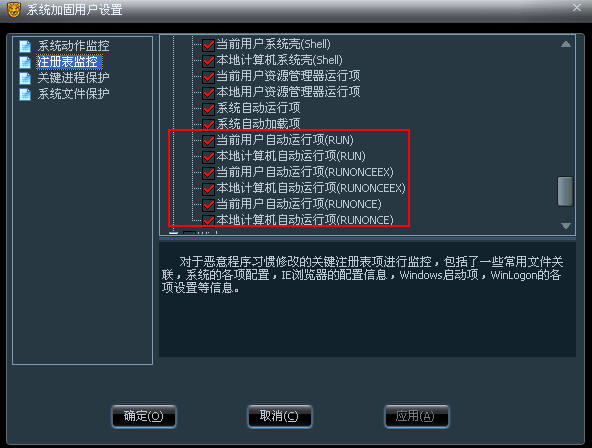 其实08瑞星只是把注册表监控换了个位置,放在了杀毒软件/防御设置/系统加固里,注意:在系统加固的默认级别时,瑞星没有对一些注册表键值进行保护,这种情况下可以将默认级别改为最高级别或者点击自定义级别/注册表监控后,将菜单下拉后能看到主要注册表“关键项”,对其进行勾选保护,这些项都是病毒经常会去修改的项,所以主要对这些“关键项”进行了防御,如图:
