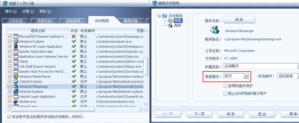 2.打开防火墙/访问规则,把MSN这项改为放行。如图: