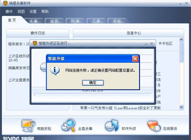 第一台的时候我以为中了病毒,先修复杀软,问题依旧,格掉系统,杀毒、重装,开始拿的是06年买的07版,联网升级后病毒版本是19.46。再格掉系统重装,找了个今年买的07版,病毒库是6月的,升级时出现提示,大概是"升级文件(null),..."。再后来就是"网络连接失败....,"。
