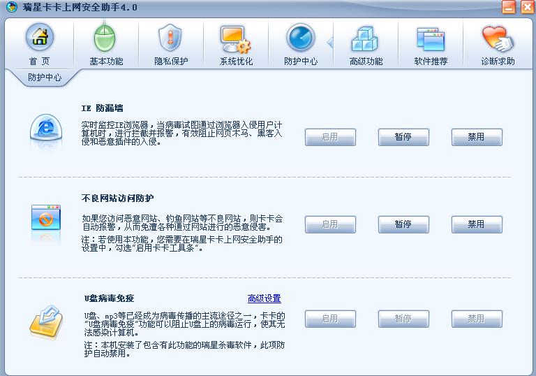 我的瑞星卡卡上网安全助手启动后总是显示“防护中心的部分防护功能已暂停”状态,怎么我已经全打开了,为什么还是不行??请问怎么解决