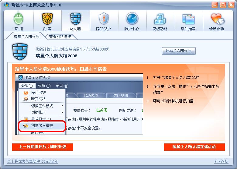 运行卡卡,点击防火墙,出现图1的界面,点击右下角“下一步使用技巧:扫描木马病毒”,出现图2的界面,再点击左下角“上一项使用技巧:即时升级”,出现图3的界面,其实图3就是刚开始的图1,但是介绍的是“防范ARP欺骗攻击”的技巧,而不是“即时升级”的技巧。希望其他用户关注,也希望瑞星再推新版本时改进。