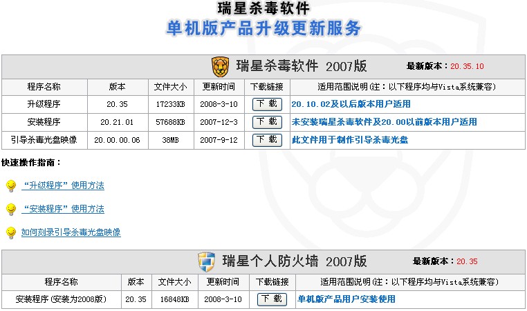 最后说明一下,因为工作(电脑维护)的关系,我经常用到瑞星“引导杀毒光盘映像”,差不多三两天就来看看有没有新版本,每次都是2007.9.12!狂晕!以前只要有人让我帮推荐杀软我一般都是让买瑞星(针对初级用户;卡巴是好,但好多人都不会设置,用不习惯。再说了咱也支持下国产软件的发展嘛)!瑞星再这样下去我得改变一下了,以后给别人推荐江民得了。