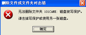 有一个数码相面用的2G的SD卡,以前把卡直接插入电脑就可以进行操作。这次把卡插入电脑,把卡上的相片复制到电脑上后,想把SD卡上的照片删除,却提示写保护。如图。