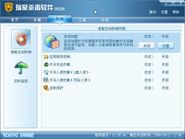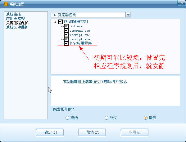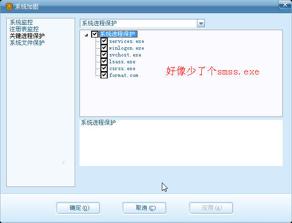 感觉这项有必要列出瑞星自我保护了哪些东东,若用户感觉不足可以自己再进行扩充。